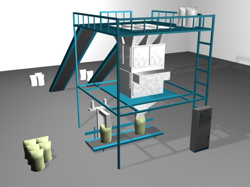 上料皮帶機(jī)、秤體支架、原料儲(chǔ)料倉、原料給料系統(tǒng)、計(jì)量系統(tǒng)、攪拌系統(tǒng)、包裝系統(tǒng)、縫包系統(tǒng)